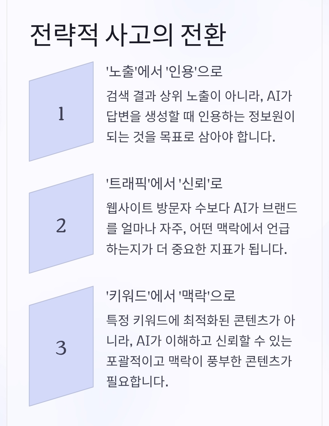 검색 결과 상위에 노출되는 것보다 AI가 답변을 생성할 때 참고하는 정보원이 되는 것이 목표가 되어야 합니다.