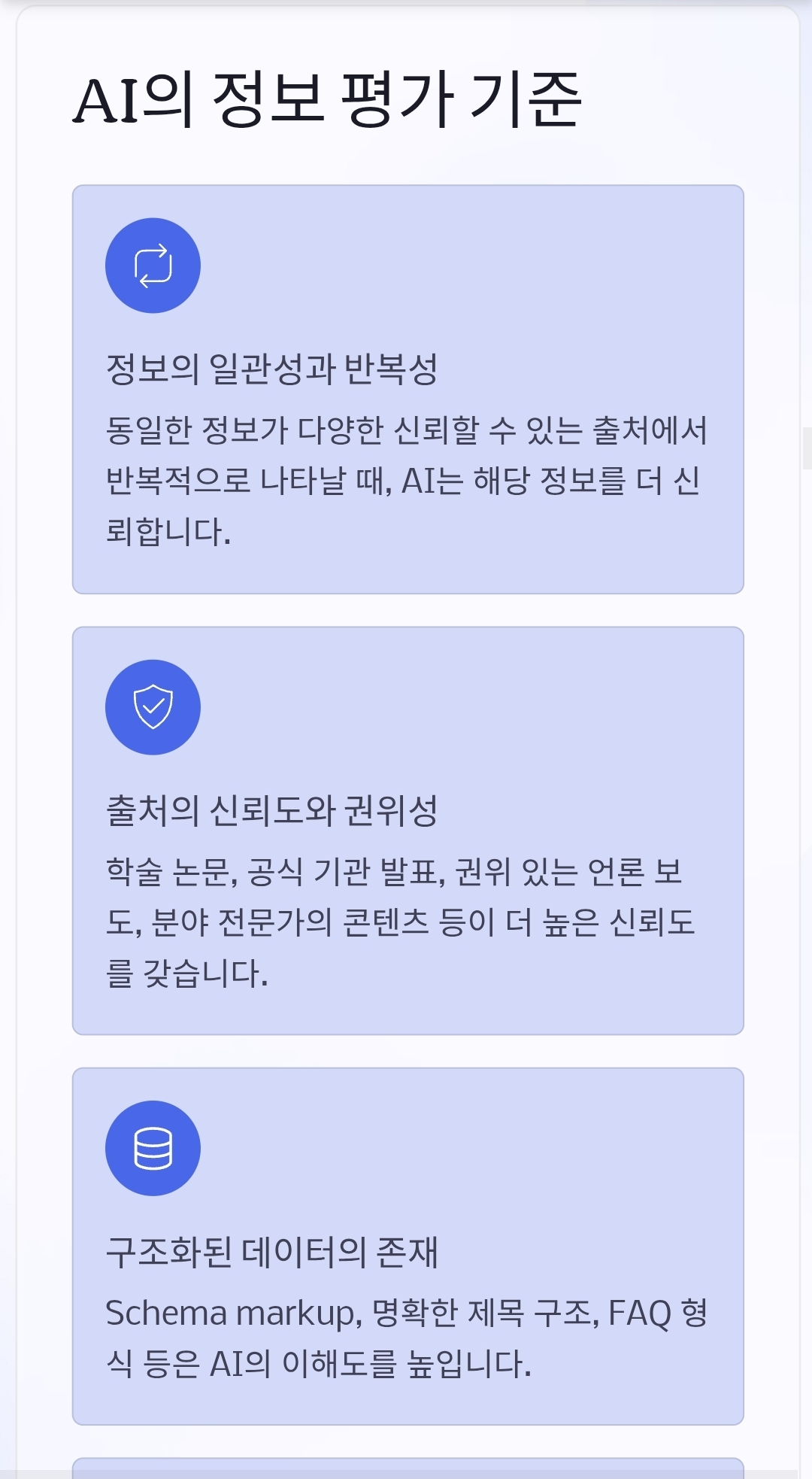 AI는 동일한 정보가 여러 신뢰 가능한 출처에서 반복적으로 등장하고, 구조화된 형식으로 제공되며, 전문성과 경험이 명확히 드러나는 콘텐츠를 우선적으로 신뢰한다.