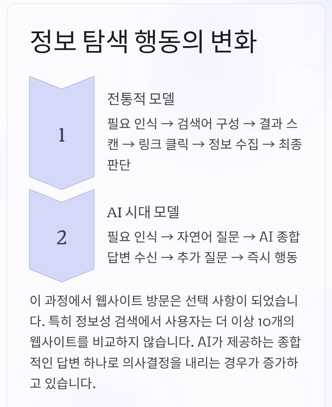 특히 정보성 검색의 경우, 사용자는 더 이상 여러 사이트를 비교하지 않고 AI가 제공하는 하나의 종합 답변으로 의사결정을 내리는 경우가 늘고 있습니다.
