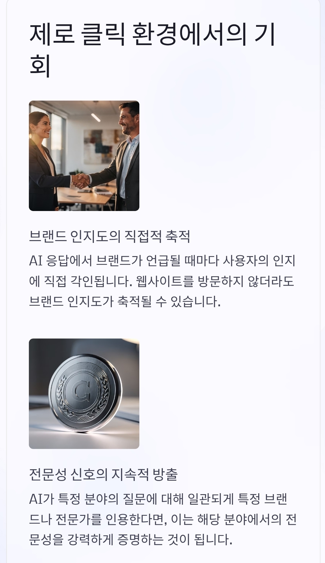 제로 클릭 환경의 확산은 트래픽 중심 마케팅의 한계를 드러낸다. 정보성 콘텐츠의 상당수가 클릭 없이 소비되면서, 웹사이트 방문 수보다 AI 답변 내 브랜드 노출과 반복 인용이 더 중요한 마케팅 자산이 되고 있다.