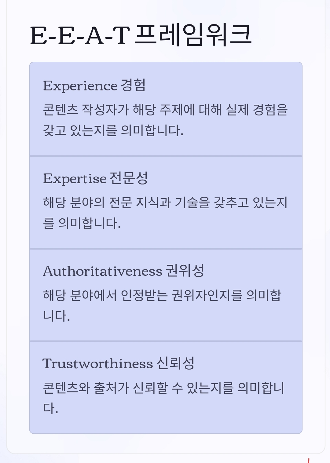 E-E-A-T 요소는 생성형 AI 시대의 핵심 콘텐츠 기준이다. 실제 경험을 바탕으로 작성된 콘텐츠, 명확한 전문성, 업계 내 권위성, 신뢰 가능한 출처를 갖춘 콘텐츠는 AI 답변에 인용될 가능성이 높다.